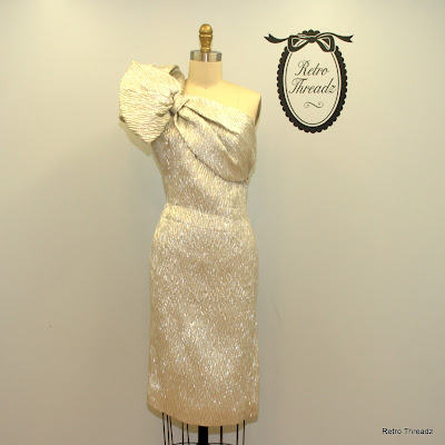 Avante-Garde Party Dress / Vintage 50s Silver Metallic Dress / Off Shoulder / Huge Bow