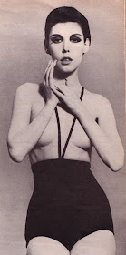 Gernreich and Moffitt became a scandalous duo when Gernreich designed the infamous 'topless bikini' dubbed the 'monokini' and Moffitt was photographed in it shortly thereafter! This bold fashion statement on Moffit's part pushed her to model star status being that she was pretty ballsy and one of few that would go that far at that time.