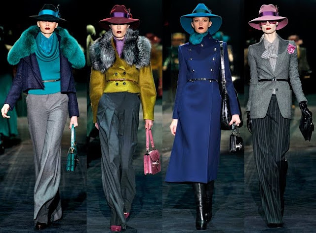 The vintage 70's is also going to get it's groove on with these funked up fashions as Gucci bolds it up with these over the top colorful fedoras paired with pinstripe slacks and dyed fur stoles.