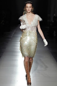 The vintage 70's is also going to get it's groove on with these funked up fashions as Gucci bolds it up with these over the top colorful fedoras paired with pinstripe slacks and dyed fur stoles.