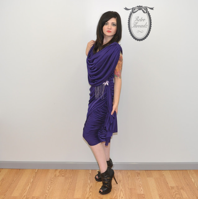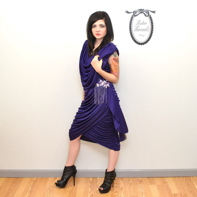 In this 'Vintage 80's', violet blue, draped, Grecian goddess style swag dress from the