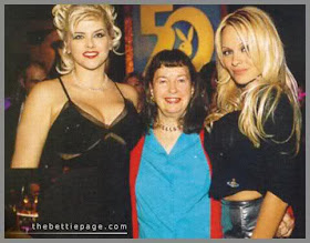 In 2003, the elderly pin up maven made an appearance at Playboy's 50th Anniversary party as seen here along with the late Anna Nicole Smith & Pam Anderson. In 2008 at the age of 85, Bettie Page passed away due to complications from pneumonia preceded by a heart attack that had left her in a coma.