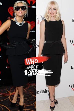 Both comedic movie star Anna Faris & pop singer Lady Gaga were seen wearing the same Audrey Hepburn inspired dress this past weekend. Gaga was in Vegas at the 'iHeartRadio Music Festival' & Faris was out and about in New York making a guest appearance on Letterman. The vintage knock off was designed by Moschino, for the Italian fashion houses Fall 2011 collection. Of course Gaga glammed up her version with some Fendi black sunglasses, pearl'esque necklace & Ferragamo black leather evening gloves. Lady Gaga also went as far as to have her hair coiffed in the signature Hepburn chignon. Faris on the other hand went more demure, accentuating her dress on a more simpler note with her only accessory being a pair of strappy Louboutins.
